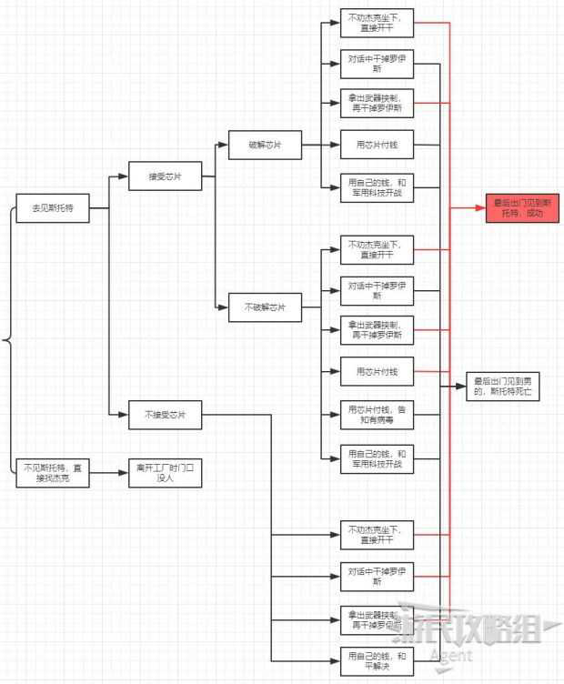如果干掉了头目,之后就是在旋涡帮的围攻下杀出来;如果没激活成功教程芯片,拿出武器挟制并给他芯片,芯片里的病毒会起作用,帮军用科技端了旋涡帮,最后需要打这个头目BOSS(个人认为这个是最正统的选择);如果激活成功教程了芯片,拿出武器挟制并给他芯片,之后好言相劝,旋涡帮就会帮你的忙,在军用科技的围攻下杀出来(他们有好几个装甲机器人)。更多其他情况参考前面的流程图。