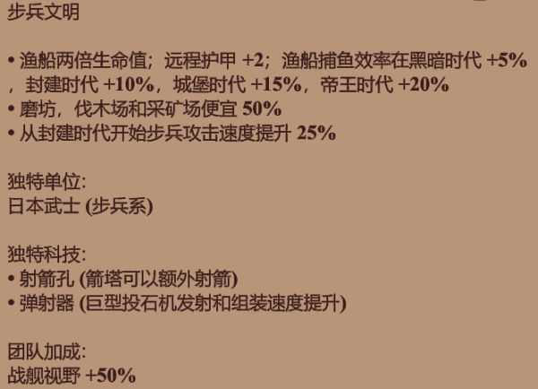 从封建时代开始,步兵攻击速度提升25%(装填速度-25%):同样的,根据数据网站[1],这个加成是减少了攻击间隔(装填速度)25%,也就是在一般步兵攻击3次的时候日本步兵能够攻击4次。这是日本主要的军事优势,不过鉴于目前中期作战仍然是骑兵、远程为主,这个加成可能在中期敌我均势时很难让日本拥有能单纯用步兵决胜的力量(不像有高远防步兵的的马里和哥特或者阿兹特克、玛雅、印加)。