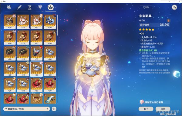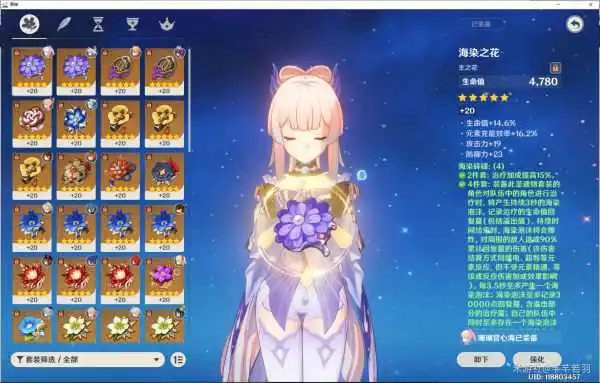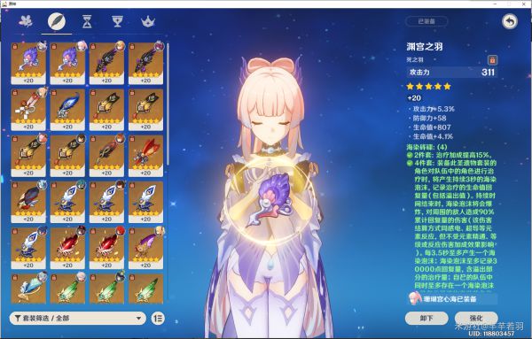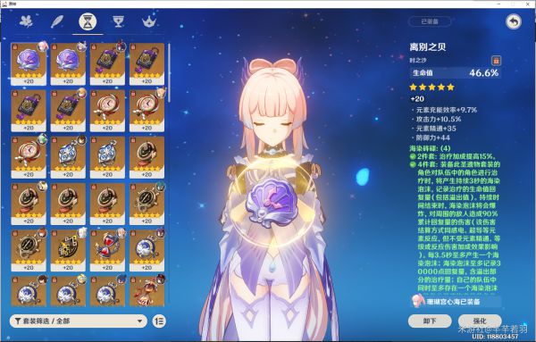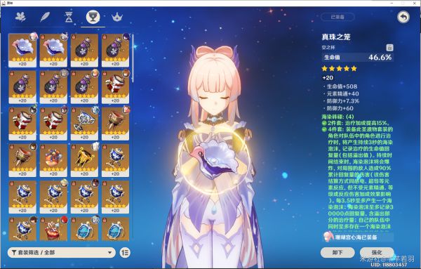 2.3开始后,刷了套凑合能用的海染砗磲,试了下伤害,惊喜的发现心海可以站场了,激动之余突然想到当时觉得水元素共鸣加治疗(效果30%)没啥用,现在一想,在这等着心海呢。