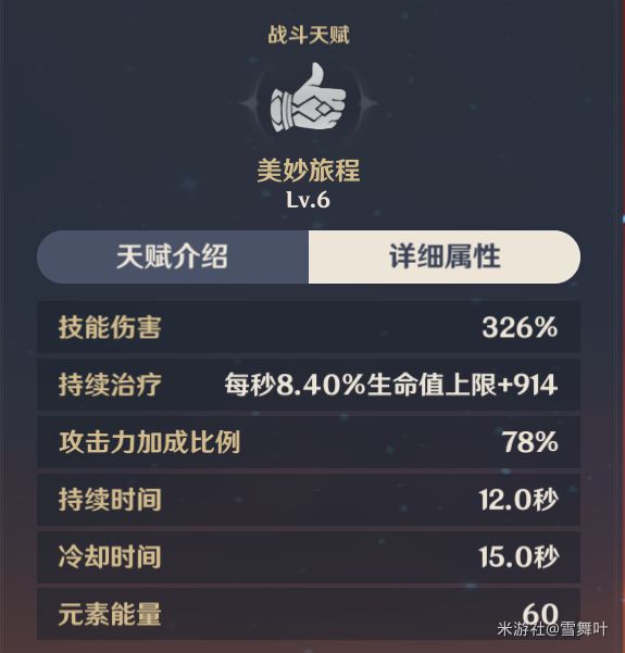 优点:回血能力强,持续时间长,冷却短,增加攻击力高,元素能量要求仅60。