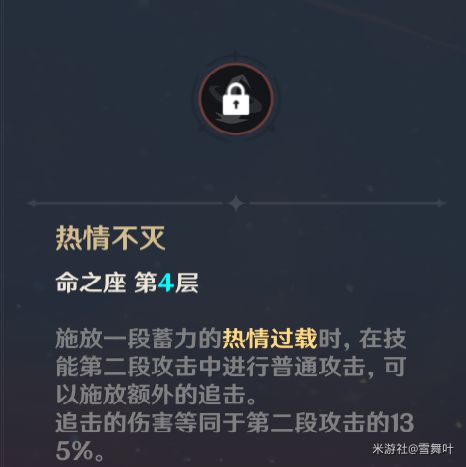 可以说是改变班尼特攻击模式的一个命之座,在4命以前,班尼特的E技能以瞬发为主。但在4命之后,班尼特必须要蓄力释放才能触发追击。而追击的伤害很高(在6级技能时为333%),所以最好的连击应该是A-A-A-A接重击,然后蓄力E技能接追击。