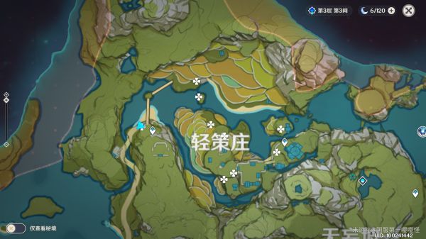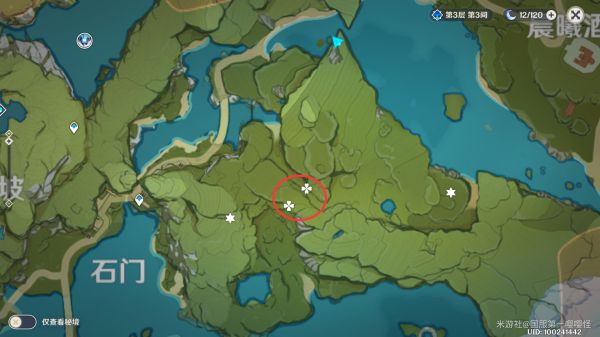石门附近的在红圈圈出来的地方,每个标记有两株,那附近或许还有,奈何地形复杂、怪又多、还没传送点只找到这两个点。