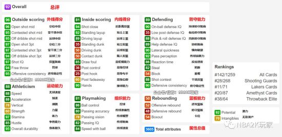 这张古德里奇的投射能力极其突出,所有投射属性小项都在90以上,其中大部分在95以上,中投三项给到了95左右,三分三项给到了97左右;内线进攻能力较差,仅常规的近距离和上篮可用;加速能力与拼抢能力不错,但由于身高建模限制,运动能力只能说总体一般。