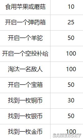 夺宝奇兵这个模式打破了必须要坚持到最后的规则,在这个模式里,只需要收集到一定的积分便可以获胜,单人模式2000,双人3000,小队模式4500。获得积分的途径有很多: