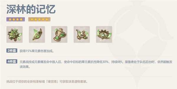 因为风套不能减少敌人的草元素抗性,于是对于草系角色而言,抗性区的加成主要就靠深林4来提供了。