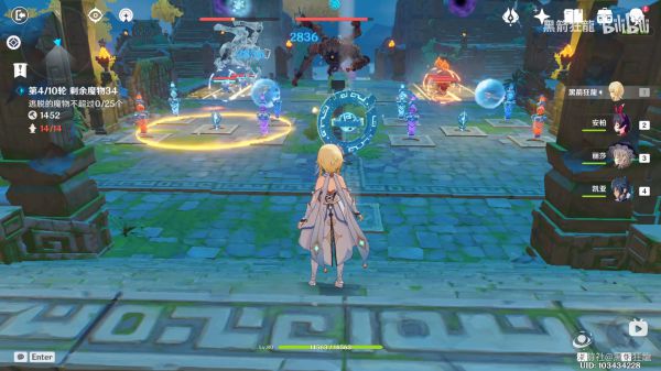 火可以靠后放一些,火的攻击范围较大,但不能太靠后,防冰盾丘丘人。