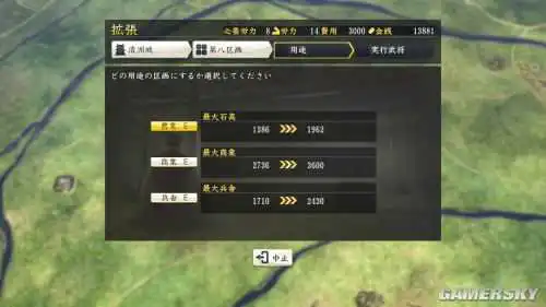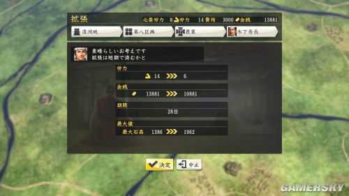 另外在内政选项中,还有一个所谓“扩张”的指令,这是可以让玩家们来扩大城下町区域的指令,当玩家们的城镇人口数增加到一定程度之后,就必须利用这个指令来扩大城下町的区域范围,如此一来才能容纳更多人口进入,而且由于区域扩张会对邻接的区域产生影响,因此玩家们必须先慎重考虑,才能有效扩大城镇来提升国力!