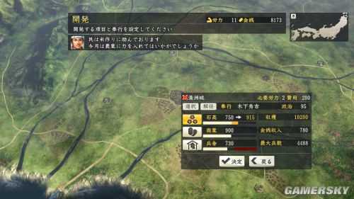 在本作“内政”系统方面,玩家们可以透过指定武将担任据点的“奉行”来实行的“开发”指令来提升象征国力基本数值如“兵粮”、“金钱”与“兵数”等等。