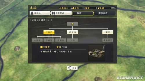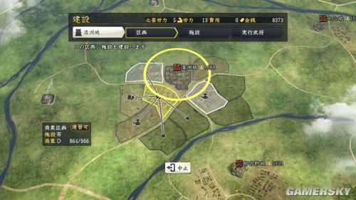 另外游戏中,玩家们也可以利用“建设”指令来进行“城”与各种“设施”(随各种设施不同,会有不同的附加效果)的开发建设(如果要让开发达上限的区域更加发展,就必须透过“建设”指令的“设施”建设才行,而在初期,将会由民众自发性建造农业区“入会地”(入会地)、商业区“市”与兵舍区“工匠馆”等谙个初期设施)。