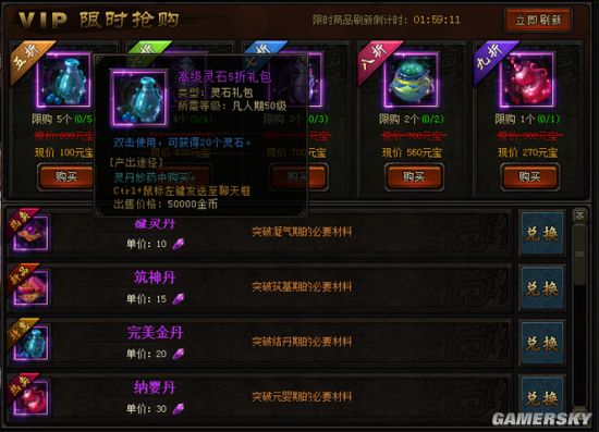 出神丹要求:提升境界所对应的道具(可在‘灵丹妙药’中消耗灵石兑换)。