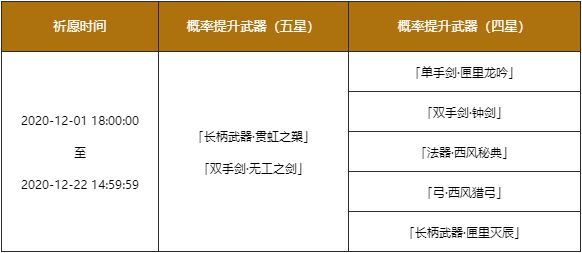 活动期间内,四星武器「单手剑·匣里龙吟」「双手剑·钟剑」「法器·西风秘典」「弓·西风猎弓」「长柄武器·匣里灭辰」的祈愿获取概率将大幅提升。