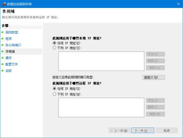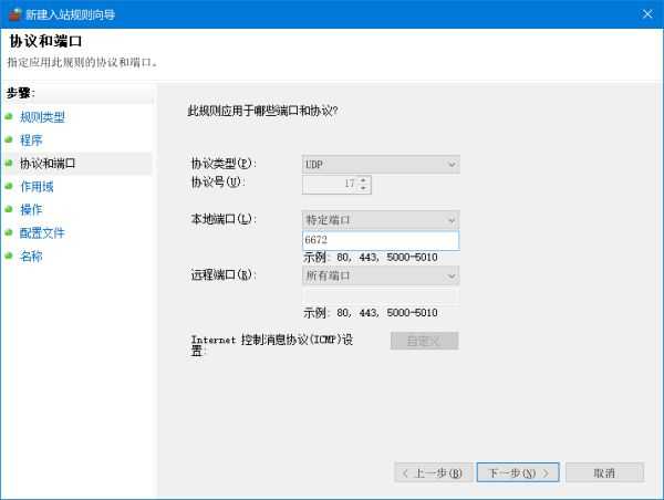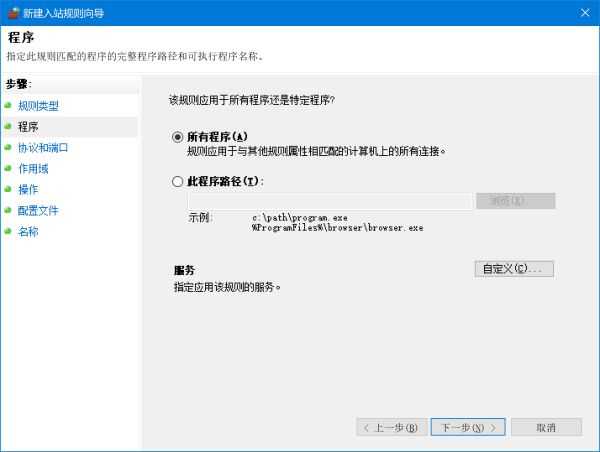 点左边的入站规则,然后往右边看,新建规则,点自定义,然后下一步,就是下面这一套: