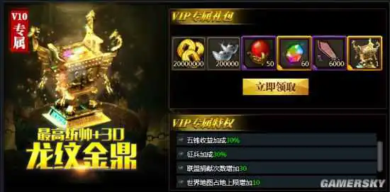 唯一VIP10宝物专属:龙纹金鼎(最高统帅+30)