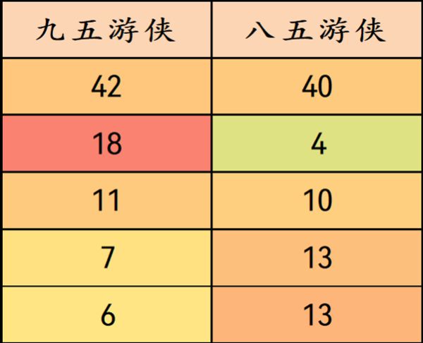 游侠体系这周摩昂听取大家的意见把八九五游侠分为八五与九五游侠,这其实是一套阵容,但是否能达到9人口对吃鸡影响较大,九五游侠吃鸡场次18场,排名第二;但八五游侠吃鸡场次仅为4场,两者相差巨大。