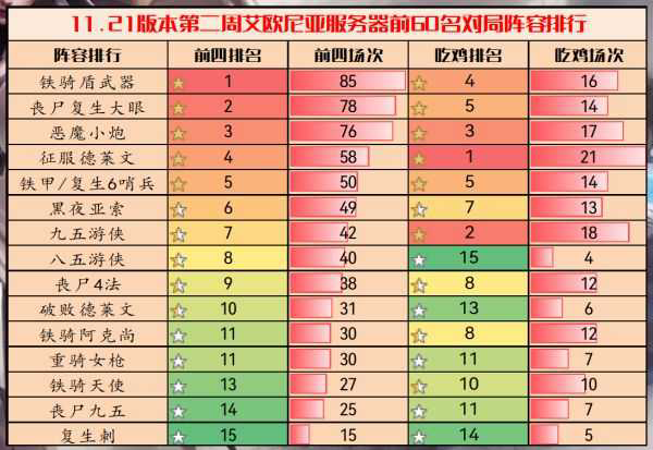 铁骑盾武器这周吃分场次85场,吃分排名第一名,吃鸡排名第4名,与与丧复大眼拉开较大差距,成为版本最强的吃分阵容。