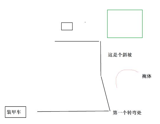 这里再提醒一下,路上有地雷,这玩意儿会炸车的,大概位置是掩体那里,斜坡那里,以及箱子(下图的黑色方块)那里,只记得这三个。