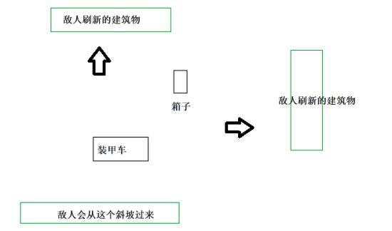 当装甲车到达下图的红色掩体的时候,拿机枪的架在掩体上面,下图绿色方块是建筑物,那里刷rpg和狙击手,机枪手马上突突突突,注意掩体右边来空降兵。