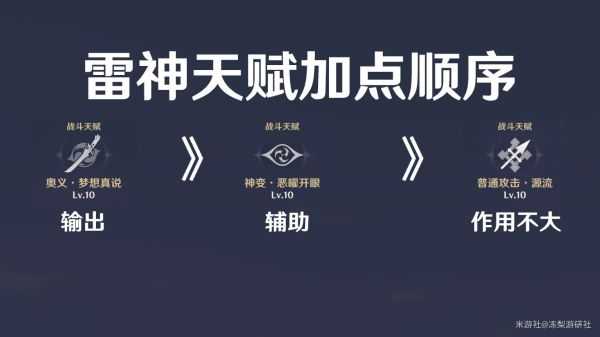雷神的天赋加点,元素爆发>元素战技>普通攻击。元素爆发是主要的输出手段,并且打满时全队能量恢复大于15(6命打满全队大招CD减5秒)。元素战技输出还是次要的,看重其对全队的元素爆发伤害增幅,比例会随着天赋等级而提升。普通攻击无所谓,可加可不加,用处不大。