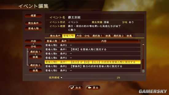 “事件编辑”系统中,玩家能够设定登场武将,例如选择武力90以上的角色,像图上的夏侯渊。