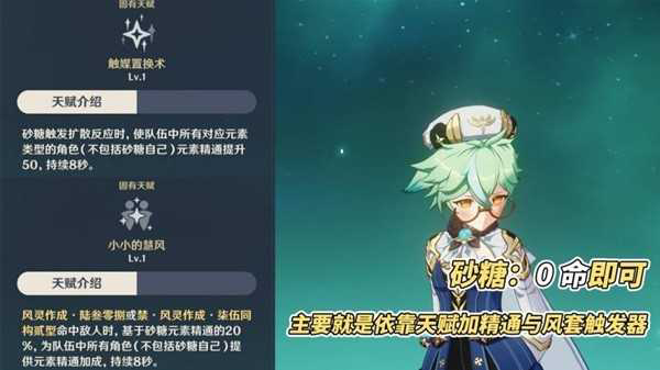 【砂糖】0命即可,其余皆为添头。常作为元素反应队伍的低配风C选择,天赋一般可为全队带来约200精通加成,外带风套触发器。现今热门玩法多为武装队驾驶员,高频风伤打扩散的同时辅助后台队友。