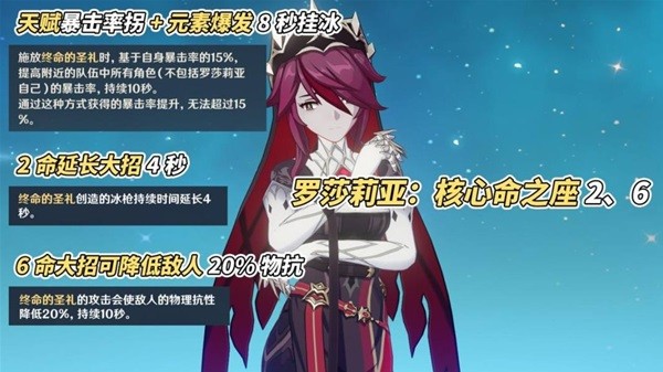 【罗莎莉亚】核心命之座2、6。其中2命可将罗莎莉亚的元素爆发持续时间空档期缩短至3秒,融化、永冻、物伤队都非常需要此命之座。如果你是玩物伤队,6命减少20%物抗的含金量不错。