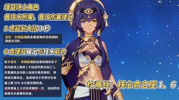【坎蒂丝】核心命之座1、6。其1命与罗莎莉亚类似的,都是起到进一步增加元素爆发覆盖率的关键,对相关玩法、体系而言能够提升舒适度。6命的队友攻击协同触发范围水伤,无论是自伤还是产草原核,都有非常大的提升。