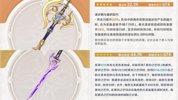 【5星武器】‘裁断’暴击攻击大剑适合主堆攻击力的双手剑角色;‘雾切之回光’暴伤增伤单手剑易触发的增伤效果,输出单手剑都可用,以攻击C最优。
