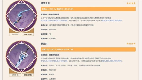 【4星武器】‘恶王丸’北斗、优菈不错;‘曚云之月’九条裟罗、甘雨(大招流)、夜兰(武器无需升级);‘笛剑’数值一般可作收藏;‘匣里灭辰’雷电将军(超绽放)、托马(烈绽放)、赛诺(超载队);‘西风秘典’以元素爆发为核心的辅助法师都可使用。