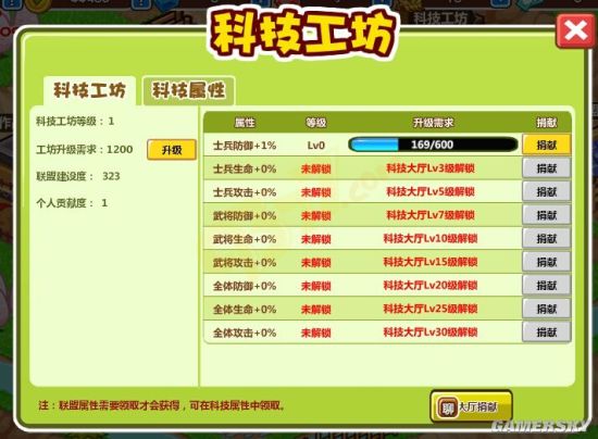 在科技工坊选项里,各联盟成员可花费金币、钻石、红钻石、将魂值来提升科技属性等级,科技属性等级越高,大家获得科技属性效果越好。另外,联盟盟主可提升科技工坊等级,解锁更多的科技属性,供联盟成员选择使用。