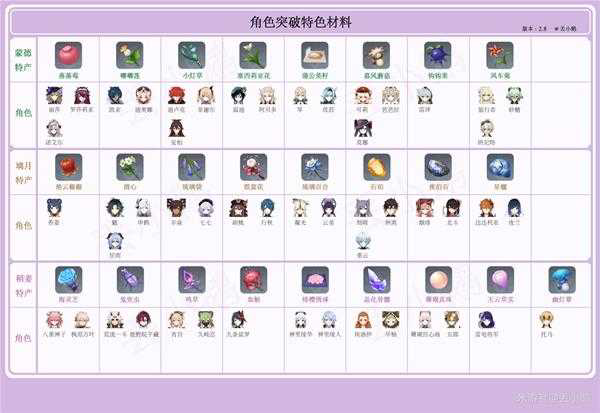 《原神》的每个区域都有自己的特产素材,这些素材也是各个角色的重要培养材料。下面请看由“丢小鹅”带来的《原神》2.8版角色区域特产培养材料整理,一起来看看吧。
