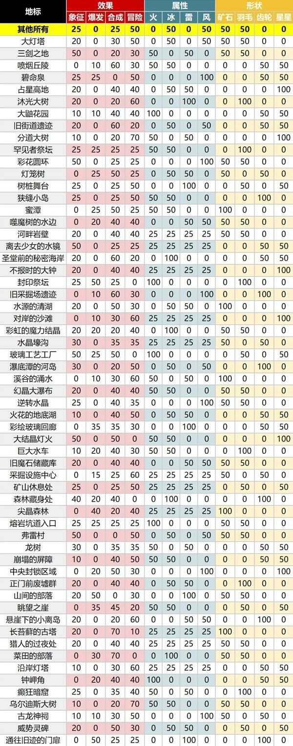 表中属性只是确定做出钥匙所包含的其中一个属性。比如在50%火50%冰的地标仍可做出火风属性的稀有钥匙。