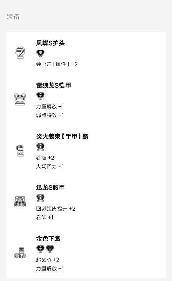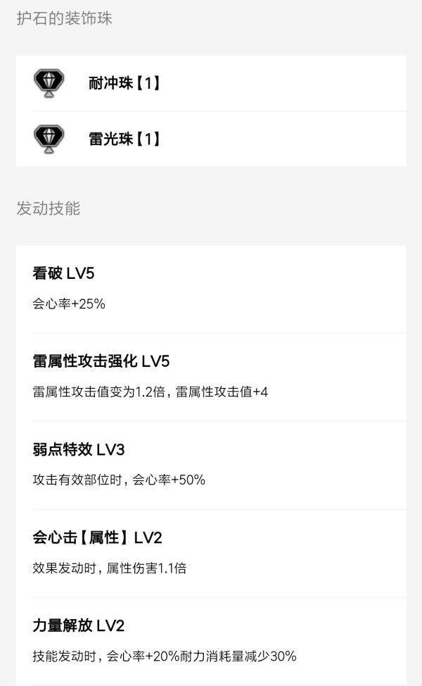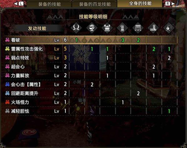 不难看出核心技能依然是以会心为核心,配合超会心和会心击【属性】以及雷属性攻击强化作为三大主要输出技能的双刀配装。