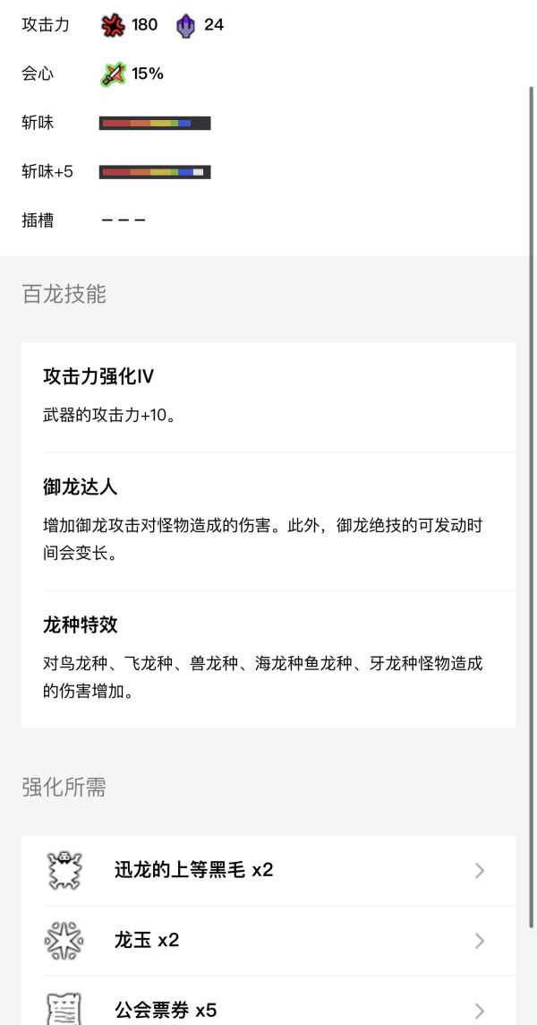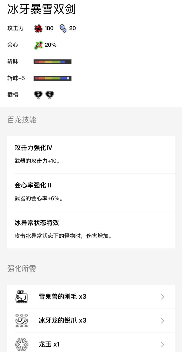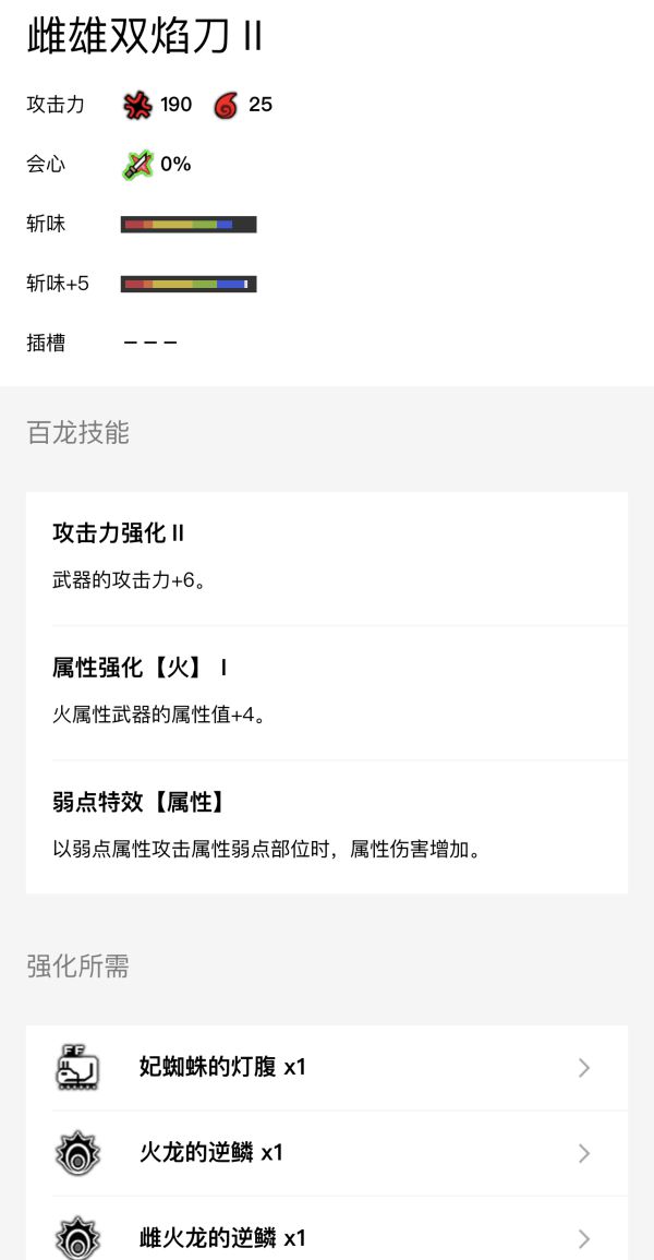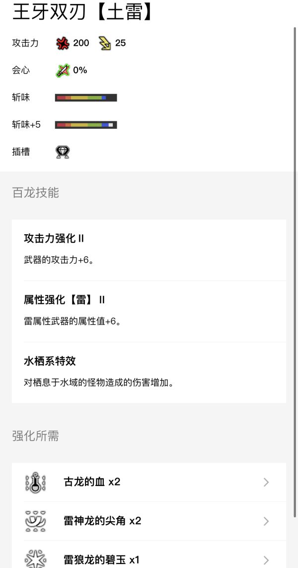 其他属性的双刀均可如法炮制,只要将插在装备上的雷光珠换成火炎珠、流水珠、冰结珠、破龙珠即可完美替换,另外记得在百龙强化中如果有“属性弱特”请务必强化。属性双刀推荐: