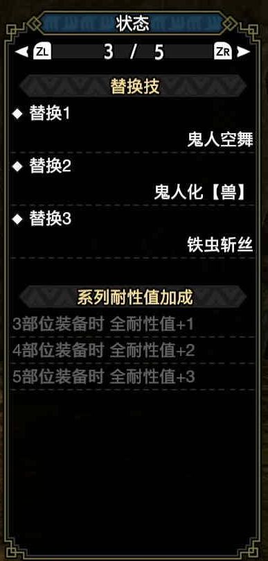 在鬼人突进斩伤害被削弱的当前版本,个人更加推荐以鬼人空舞为核心的双刀打法。三个虫技的选择分别为: