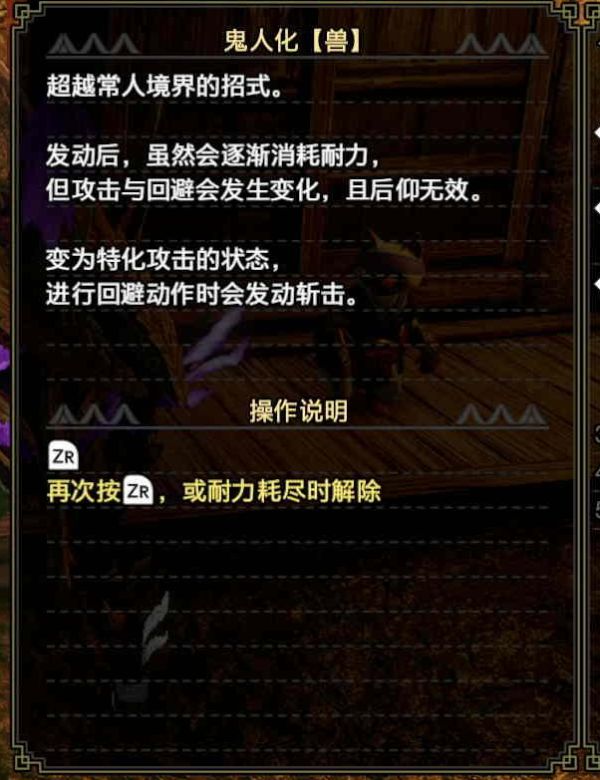 鬼人化【兽】,在回避和开启状态时会带有攻击判定,体感上比普通鬼人化要好用一些。