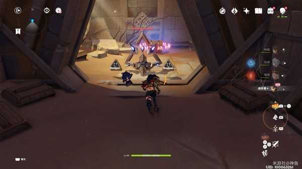 继续前进 派蒙和迪希雅给旅行者提示 先旋转中间的金字塔2次 让紫、黄色的光照到金字塔对应的接收器上 使其下沉