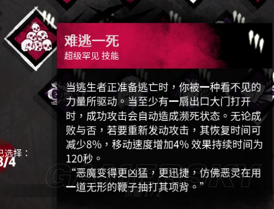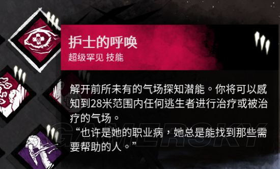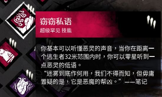 效果:当以你为直径32米的圆中有幸存者的时候这个技能会亮并且有会恶灵喘气的声音