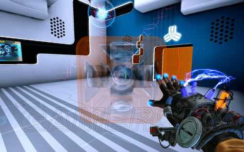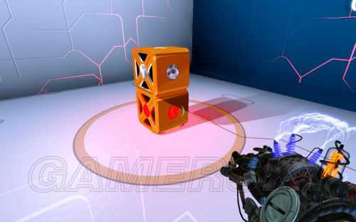 进入房间后,向右上角观察,会看到两个磁力方块被放在高墙上,用磁力枪将两个磁力块改成相同或相反的磁极,两个磁力块就会掉到地上,这样就可以使用了。