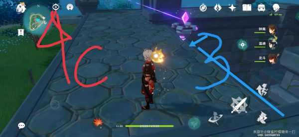 首先从地下捞出三个继电石一个雷灵(需要做遗迹退水的前置解谜,此处不做赘述,各位旅行者可以自行查找相关攻略),注意不要越过最靠近秘境的一个放电石头(A)的位置,否则继电石会消失回到原位