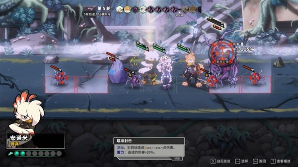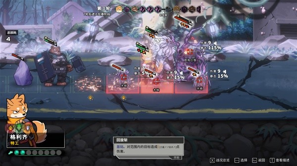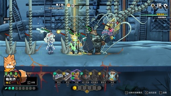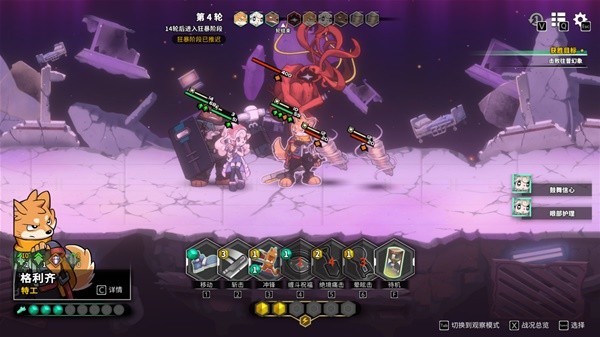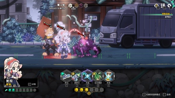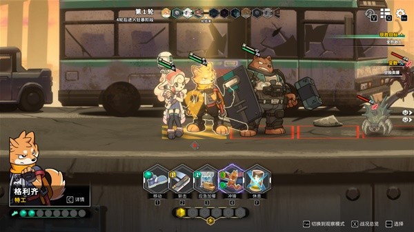 以下图为例,敌人和我方的血量差距巨大,不过基本敌人的攻击是有“弹道”而非“锁头”,给了操作的可能性——我们的特工狐狸可以移动到它身后,兔子医师则可以后撤一步,就能避开攻击。在《异界失控》中,不存在传统xcom式游戏的“攻击后结束回合”设定,所以可以达成非常自己的操作顺序,这一方面增加了容错率;另一方面和共容易达成和队友的配对合击。