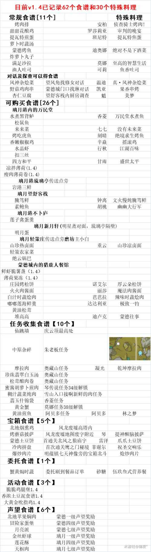 《原神》中有许许多多的食谱,可能有一些玩家想要做到食谱的全收集却不知道该去哪里寻找,那么不妨来看看“锦夜"”为大家带来的《原神》1.4版本食谱与收集方式一览表,希望能够帮助到大家。