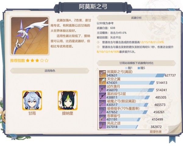 常驻五星武器,常驻池也可以出。基本上是甘雨在用,另外一个能用的只有小提了(所以阿莫斯也有人叫痛苦弓)
