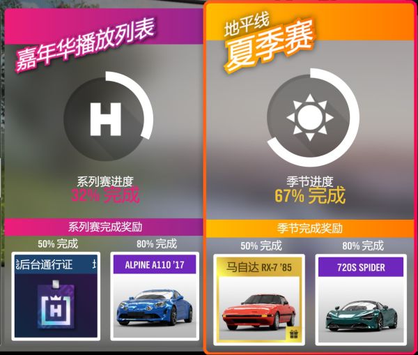 从左至右,前两个框为你的完成度可以换取的物品,一般是稀有车,稀有服饰,后台通行证。左边的是这个月完成的。右边的是这周的。