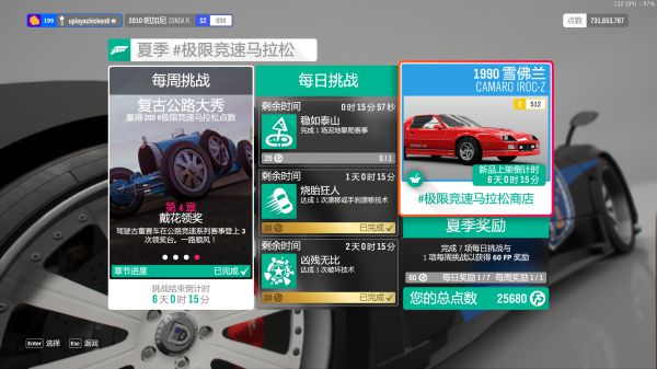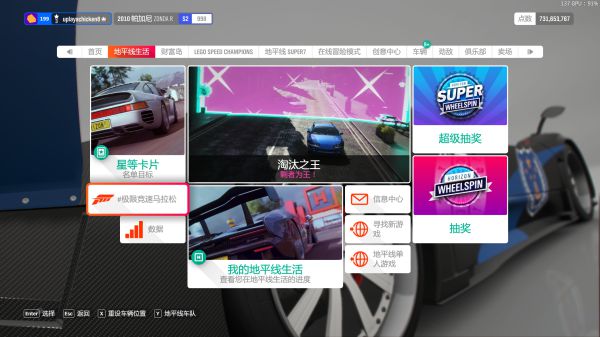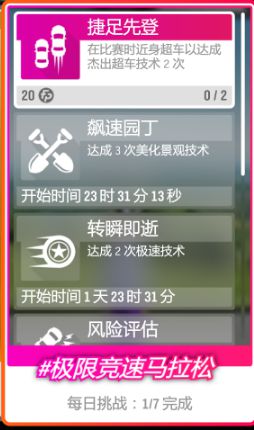 较为繁琐,四场挑战,需要选择特定车型完成特定挑战。这个包含的问题挺多,完成后可以获取200点马拉松点数,点数可以在马拉松商店购买稀有车,喇叭,服饰和抽奖。位置为菜单第二个地平线生活红框位置。