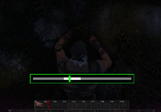 部分岛上没有淡水湖的,在植物较多的地方,按X趴下,然后会出现一个QTE小游戏,光标到白色区域的时候按下鼠标左键,点大概3次之后,就可以挖出一小口喷泉,对着喷泉按E喝水(徒手挖一次是60水,铲子挖一次600水)。