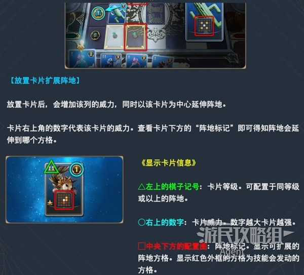 卡片下方是阵地标记(下图红色框),代表这张卡片放到棋盘上后,可以占领的地盘范围。白色方块代表卡片本身所处位置,黄色方块代表占地范围,红色方块代表卡片技能起效果的区域。