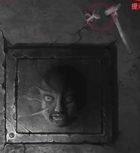 掀开帘子,调查墙面,发现右上有一个洞,这时候把刚从小人偶那获得的钉子放入,再用锤子敲击