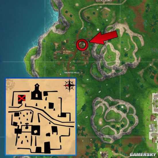根据海景别墅的藏宝图显示,宝藏地点位于幽灵山右上角的房子上,大教堂的北侧。
