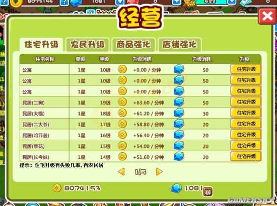 玩家要升级住宅等级,通过界面下方的“经营”图标,进入到经营操作界面,就能找到住宅升级界面。大家选中需要升级的住宅,“住宅升级”按钮,可花费钻石对住宅进行升级操作。目前,村长征战团住宅的星级满星为3星,而等级满级为30级。其中,住宅等级每升满10级,住宅星级提高1星。