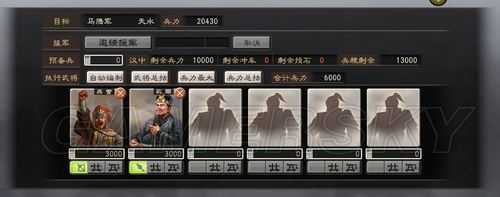 战斗解说:此超强阵营6000精兵足以将马腾吓到屁滚尿流,龟缩到城里不敢出来,是经过多次测试的结果。如果不带张鲁的枪兵而使用其他兵种的人,则无法起到震慑马腾的作用,马家军会倾巢而出,后果不可想象。本着不浪费的原则,在我方士兵相对少的情况下,敌人也会省着出兵的,所以第一战如出兵太多,不仅占不到优势,还浪费了大批军粮,往后张鲁一干人马就只能在家种地了。